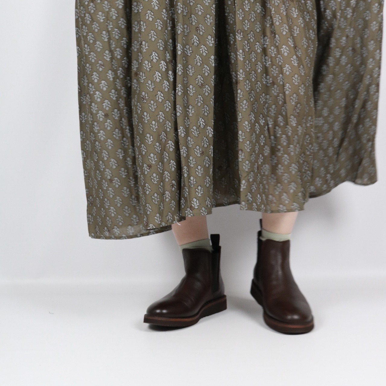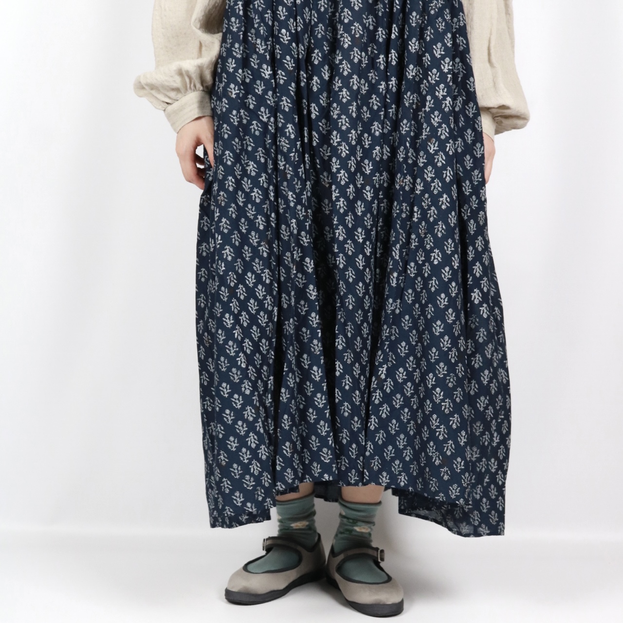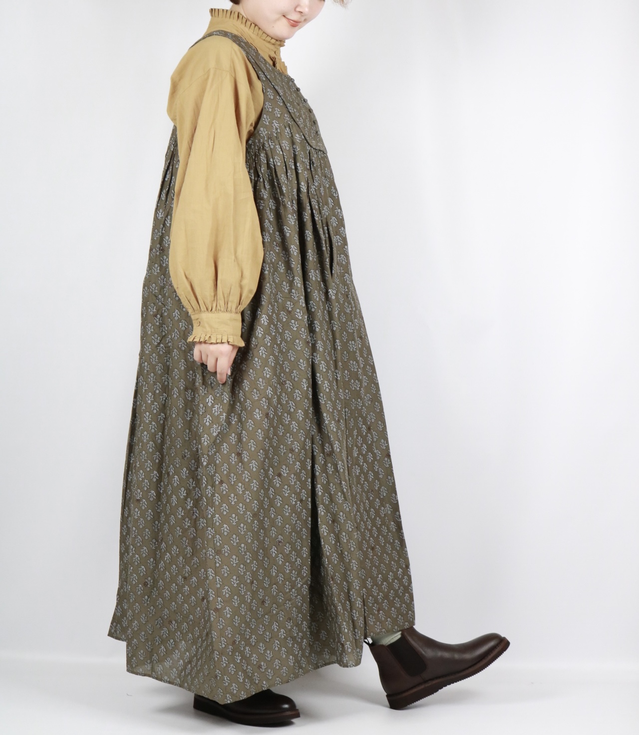 切り替えの下は、ラジャスタンタックギャザー(インド北西部のラジャスタン地方に伝わる細かいタックとギャザー使い)を施すことで、ふんわりと柔らかなシルエットに仕上がっています。