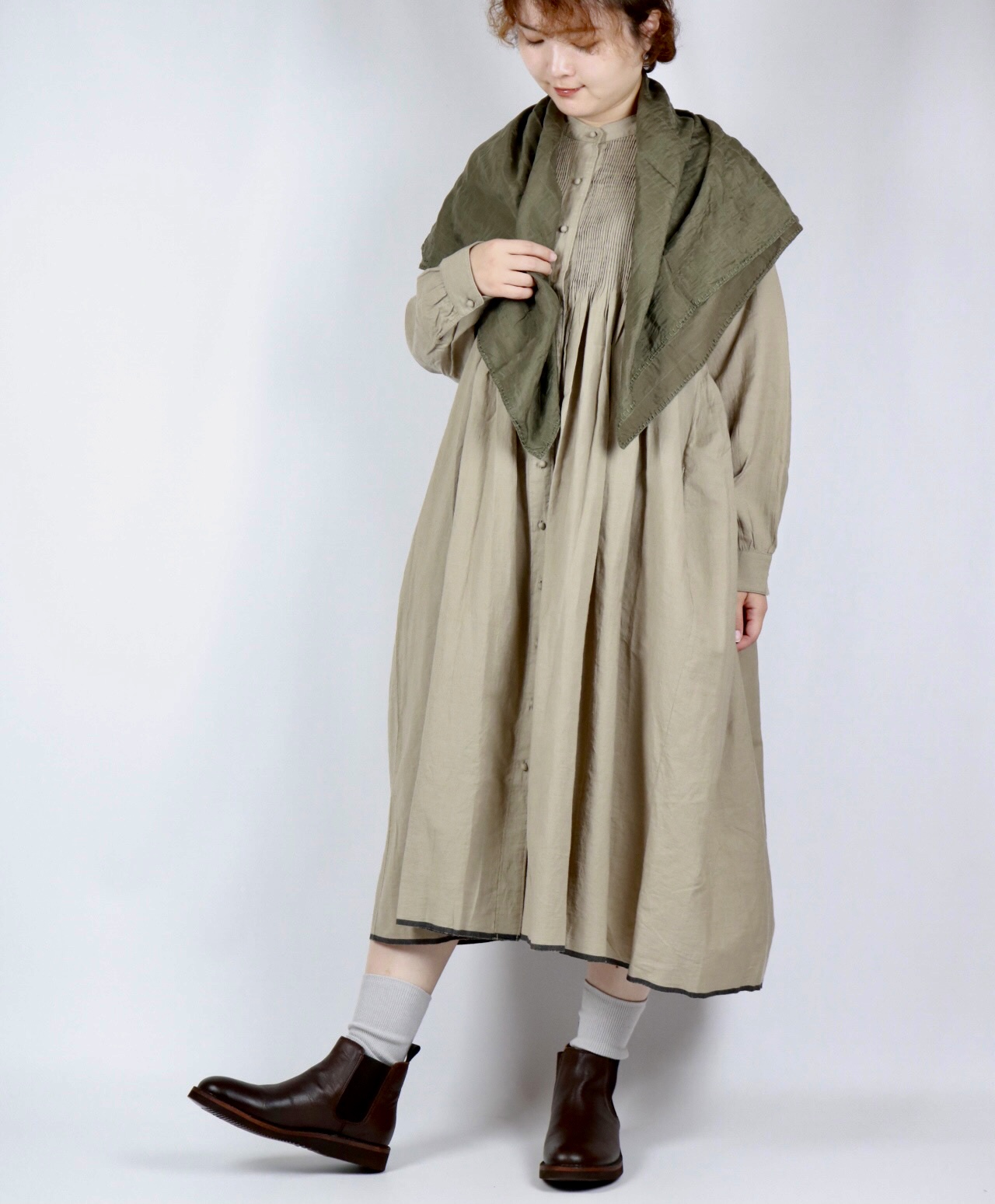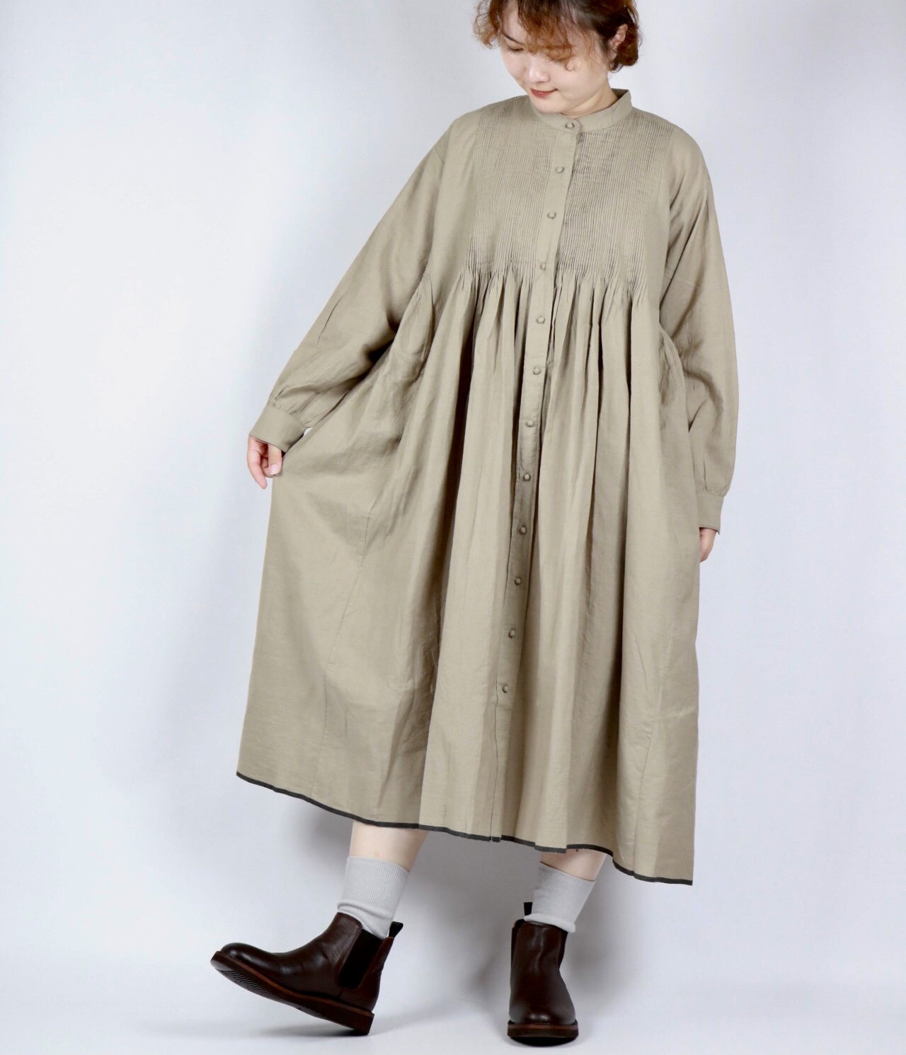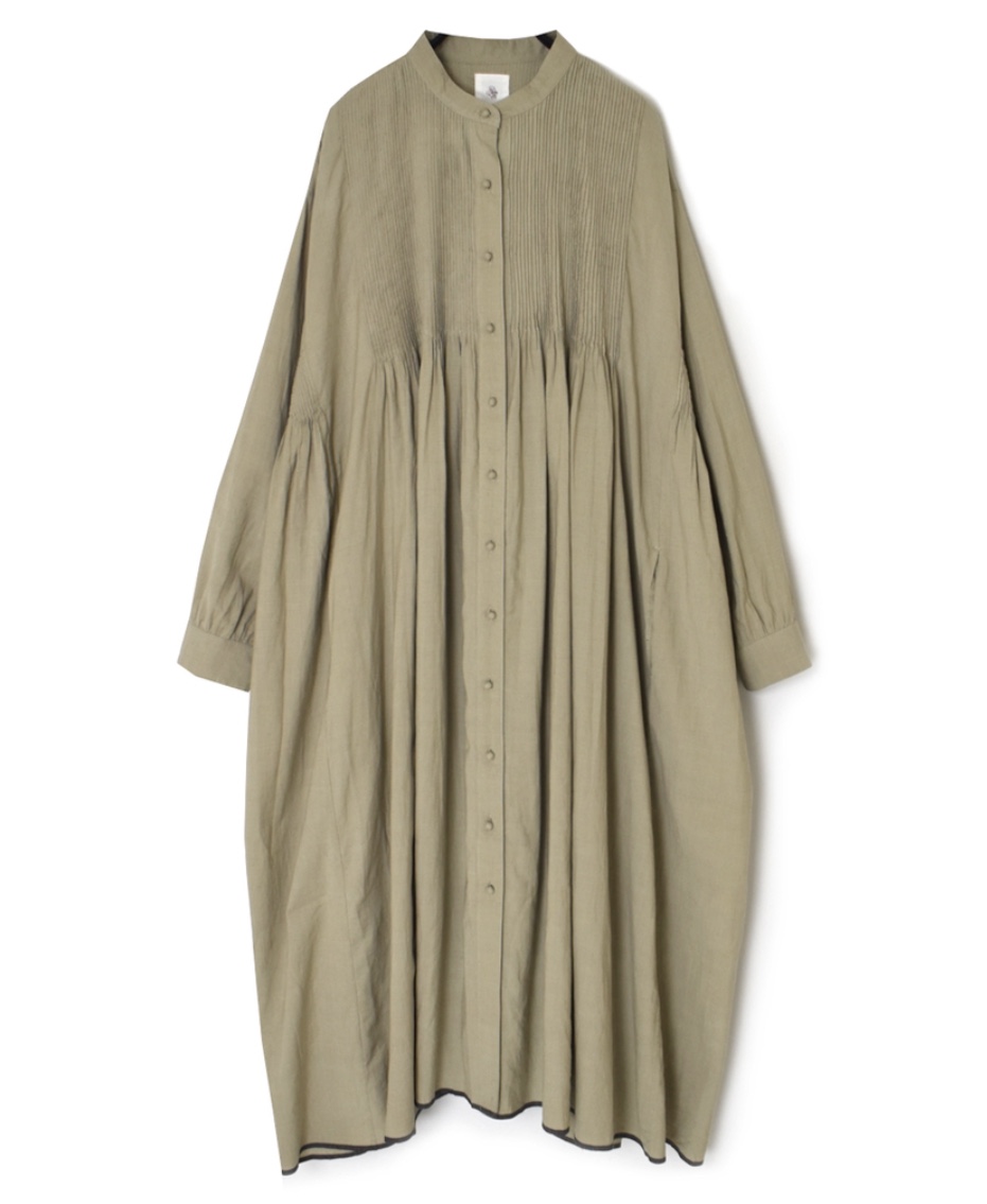 前後身頃に施された無数の細かなピンタックが特徴的なバンドカラーのワンピースは、