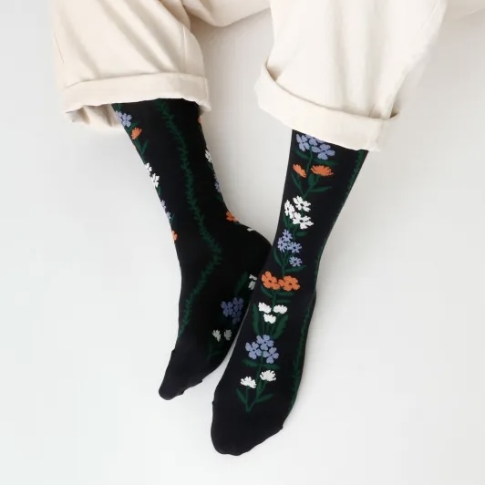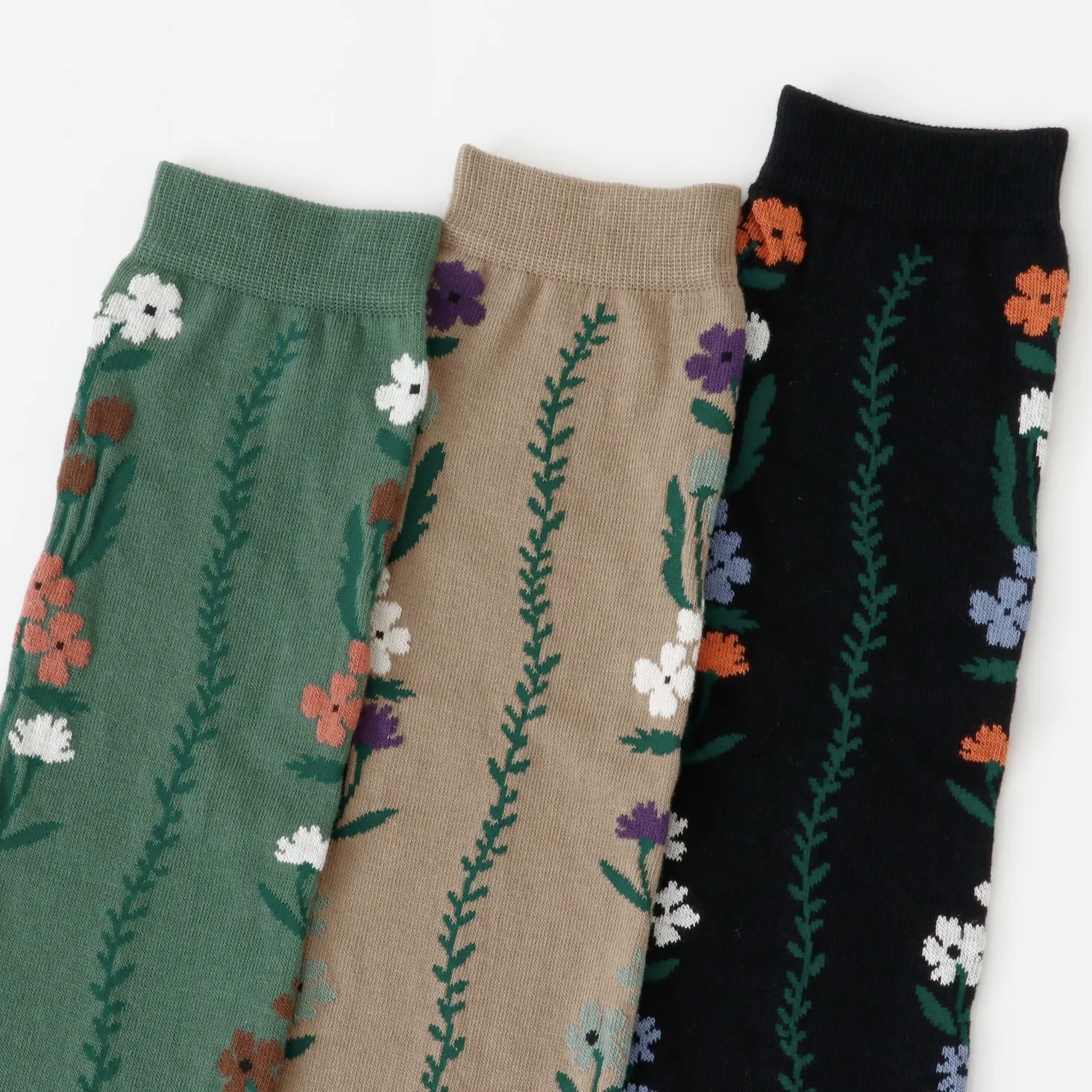 花の連なりで幸せの連鎖を表現した柄のハイソックスが