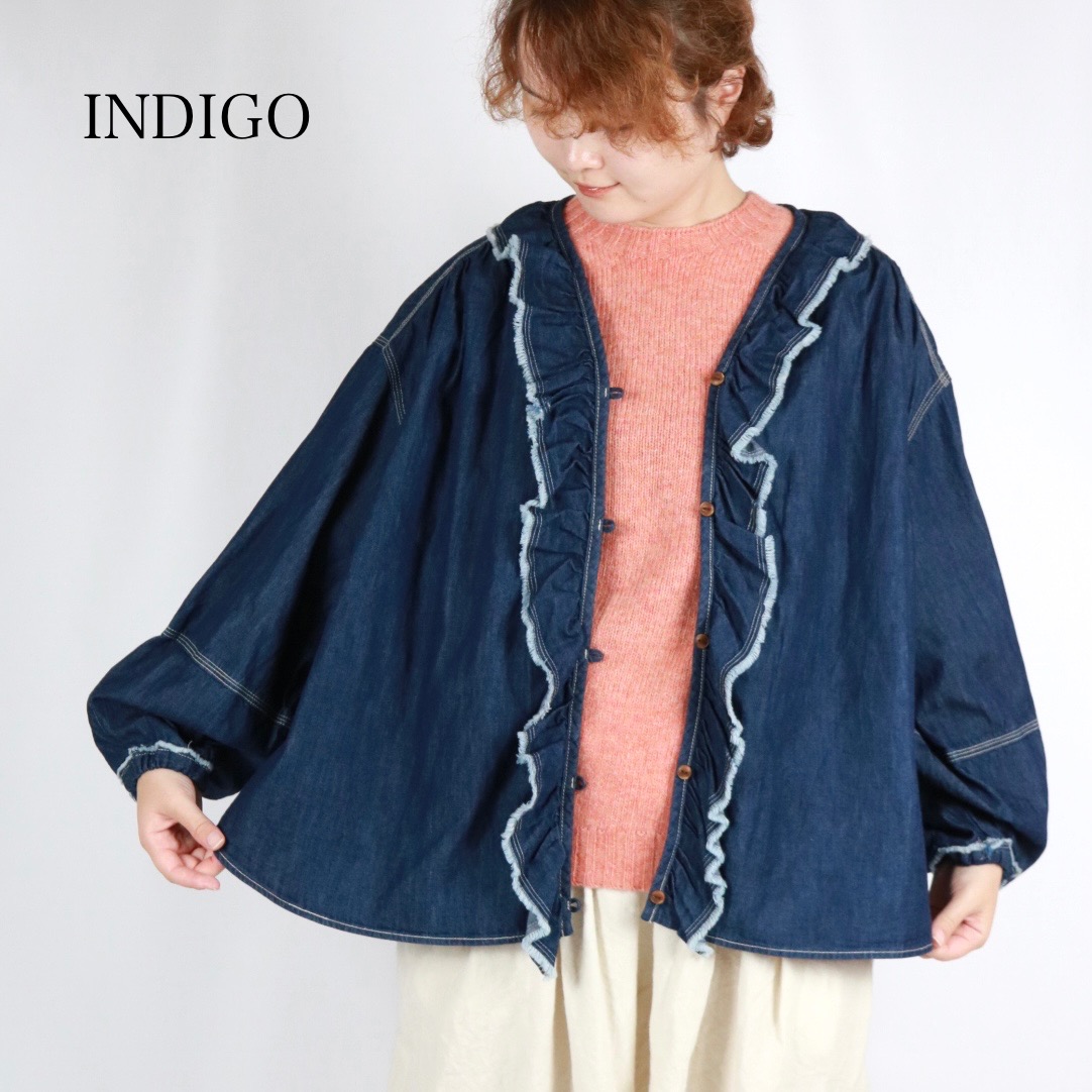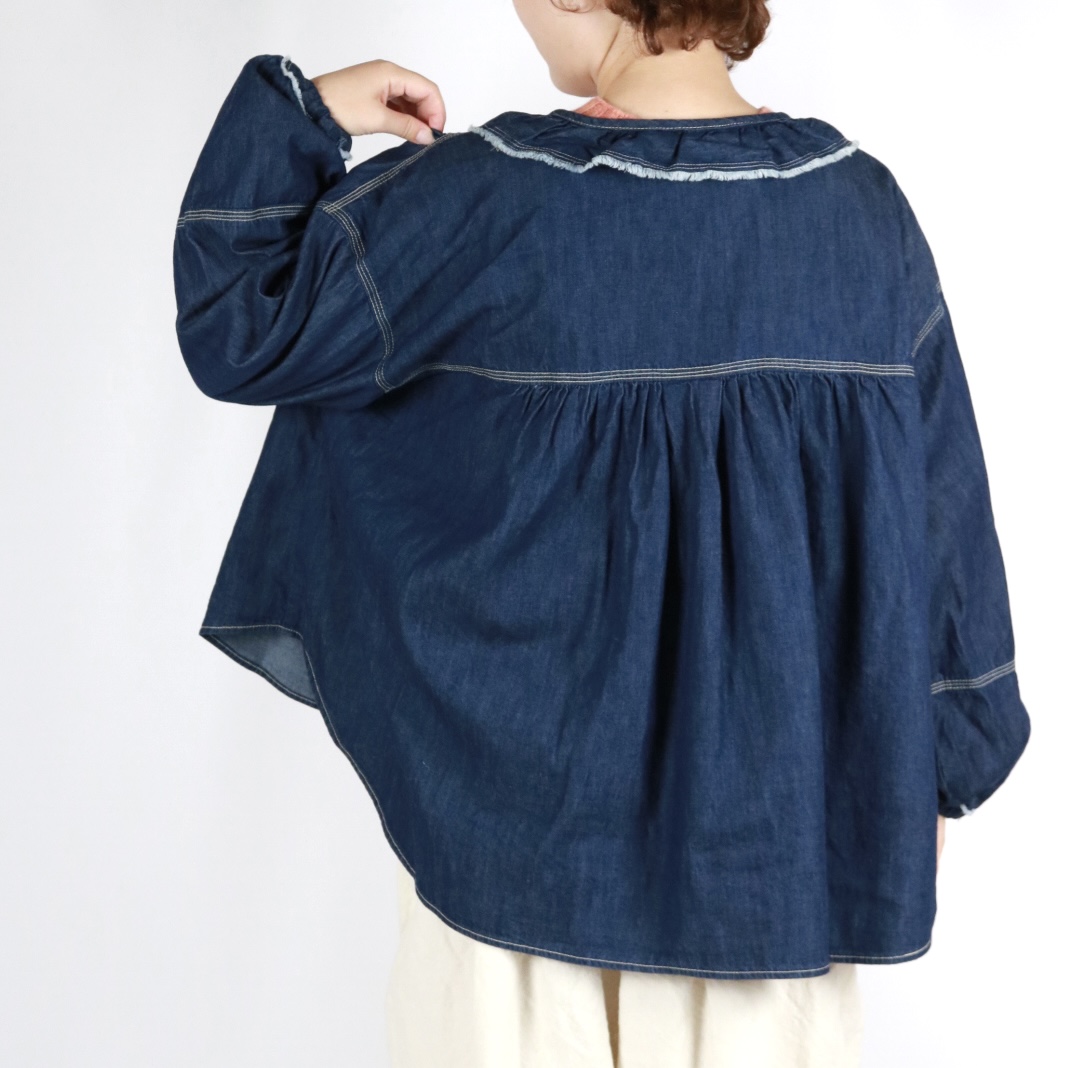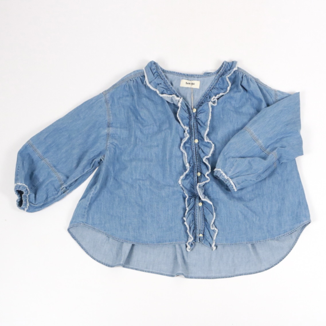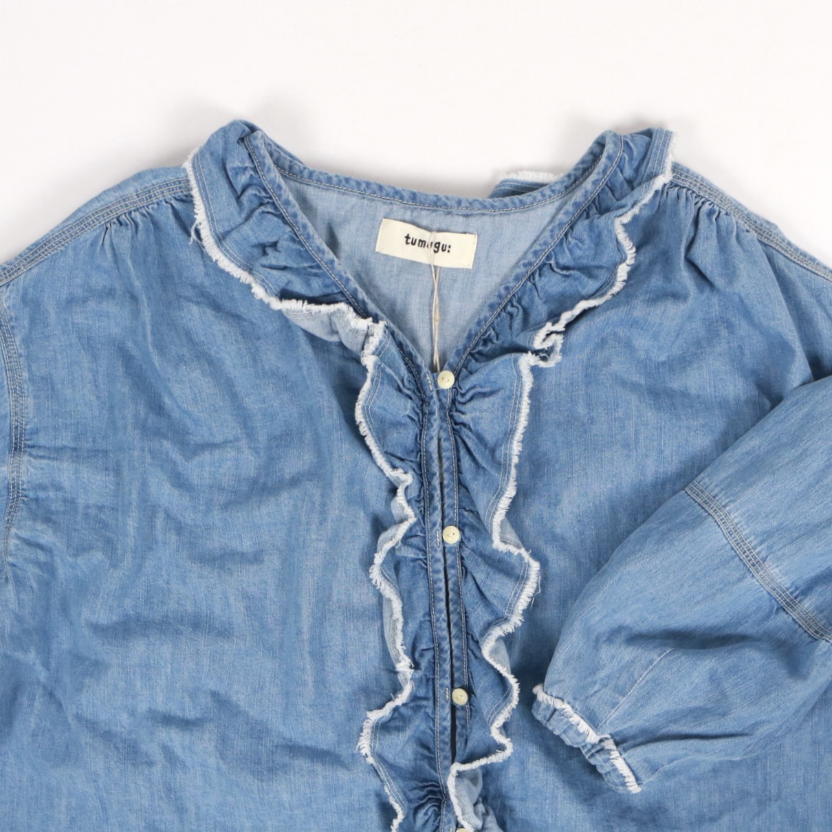 - > tumugu: ライトオンスデニムフリルブラウス 2色