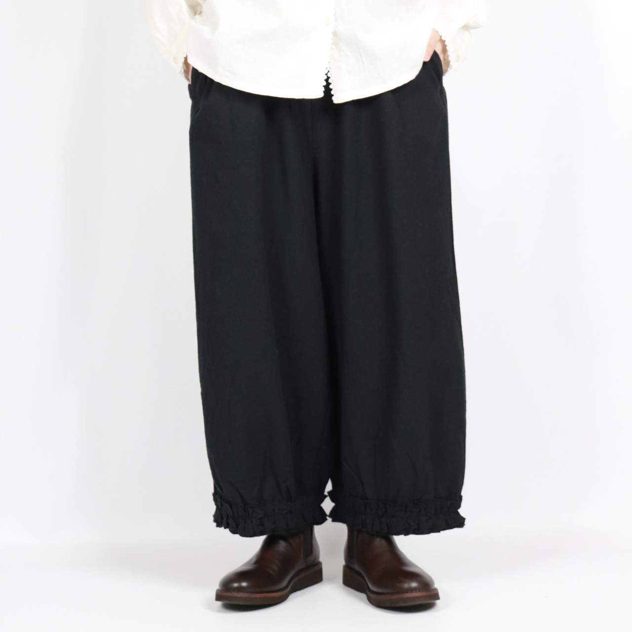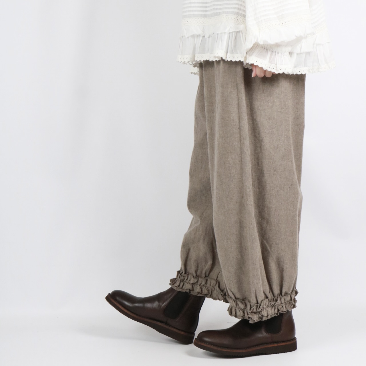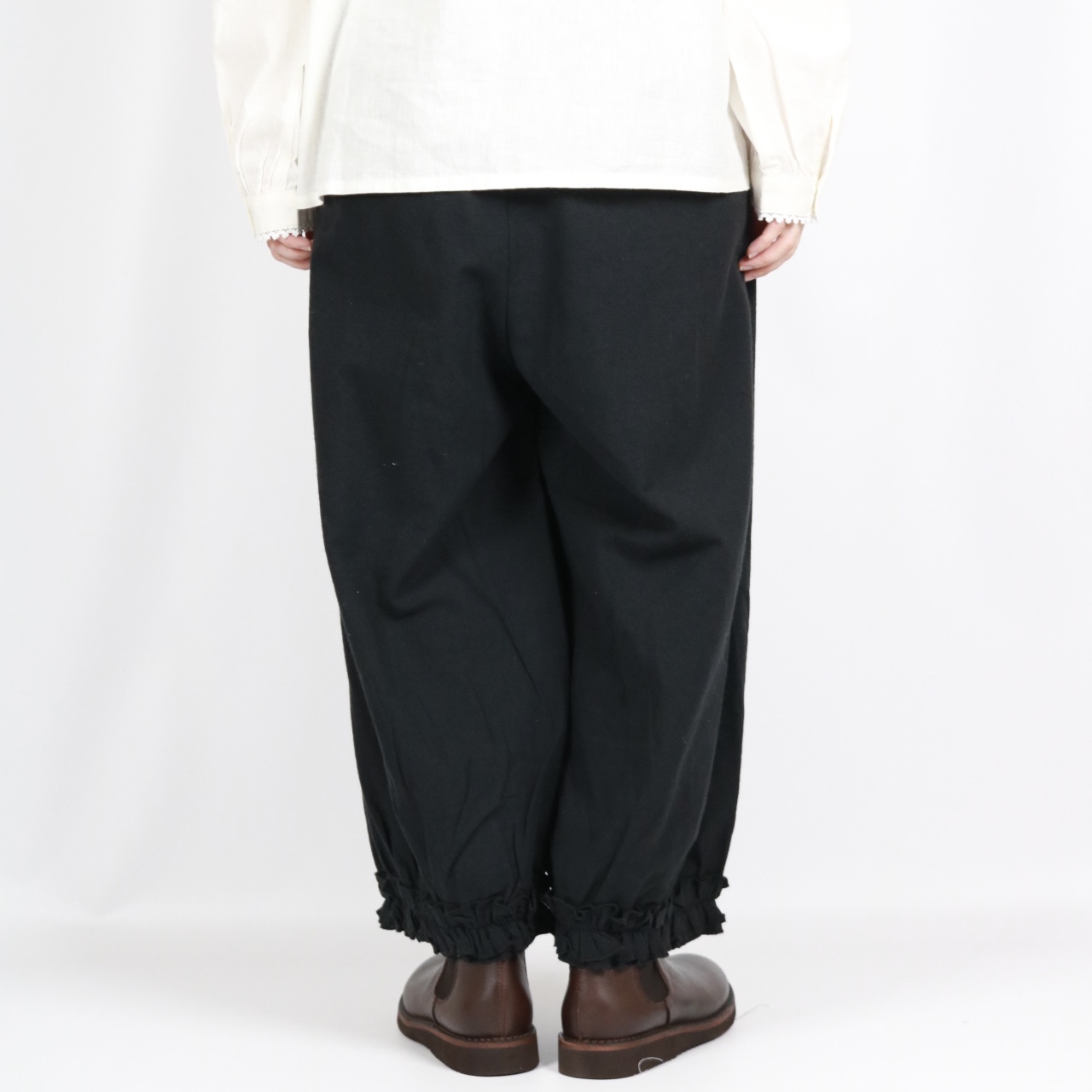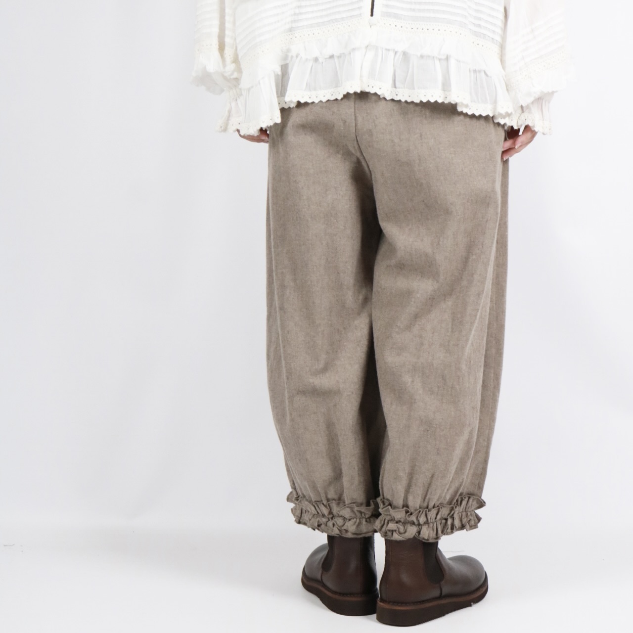 - > bluewillow コットン平織り無地起毛裾フリルパンツ 3色