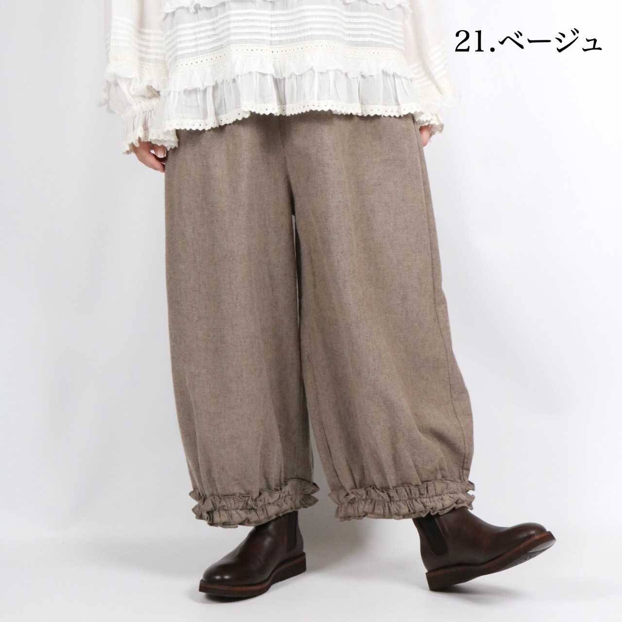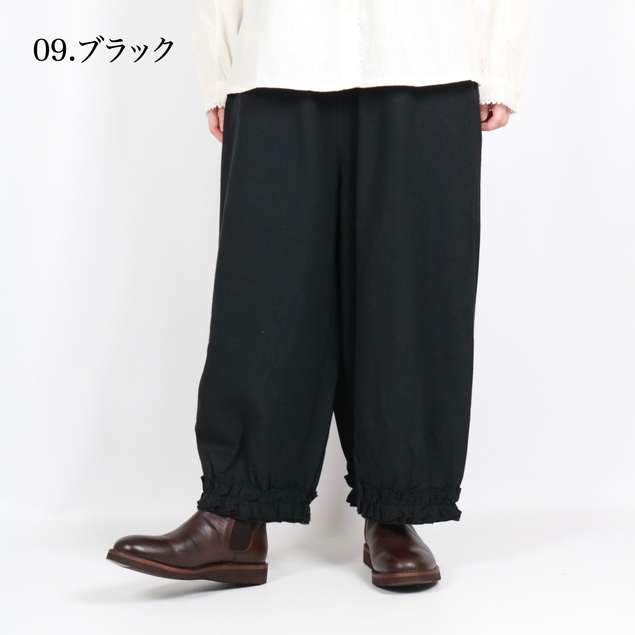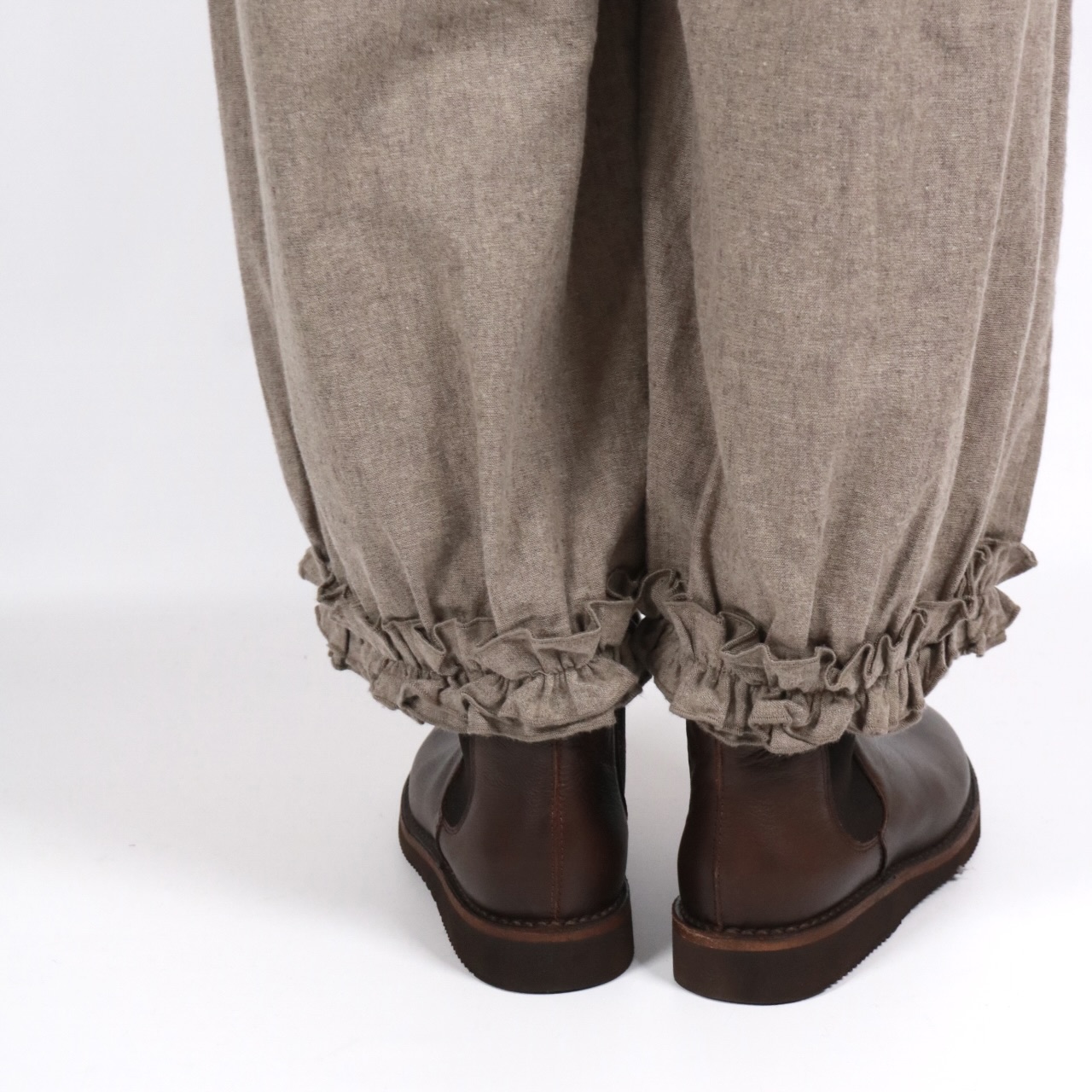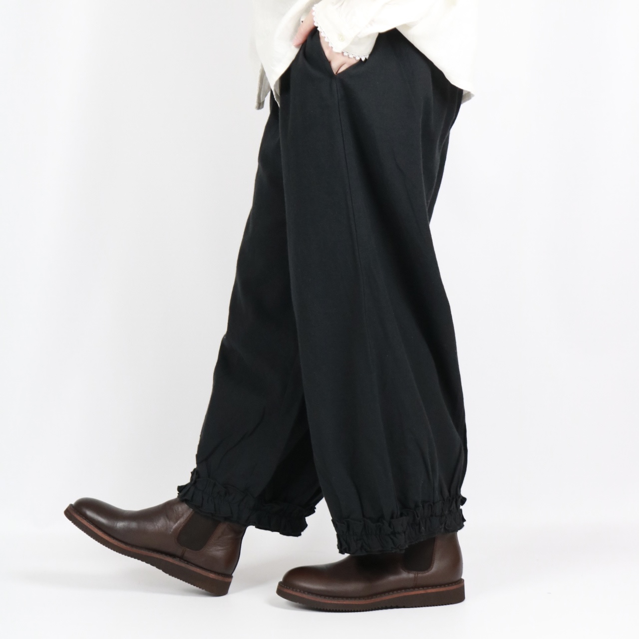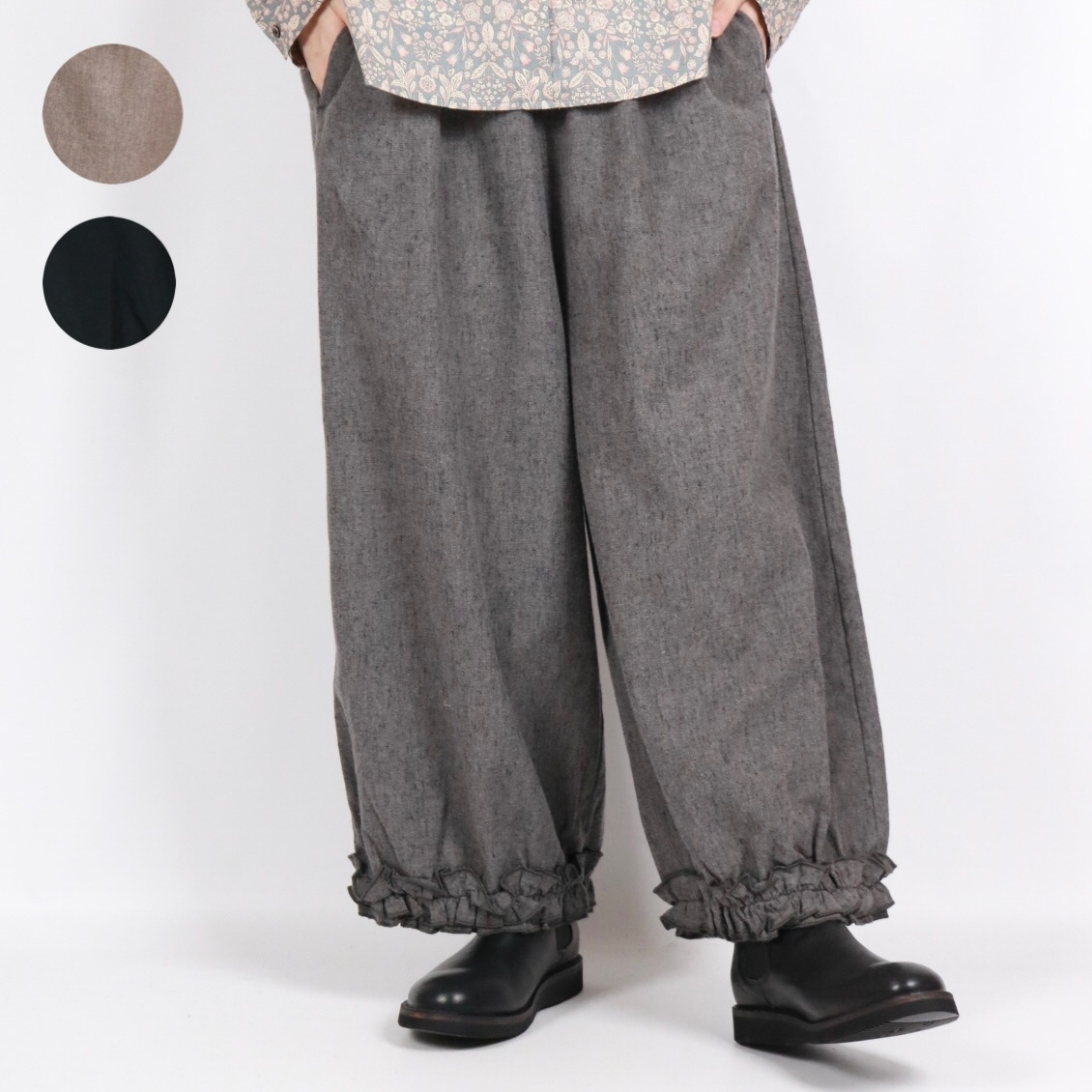 - > bluewillow コットン平織り無地起毛裾フリルパンツ 3色