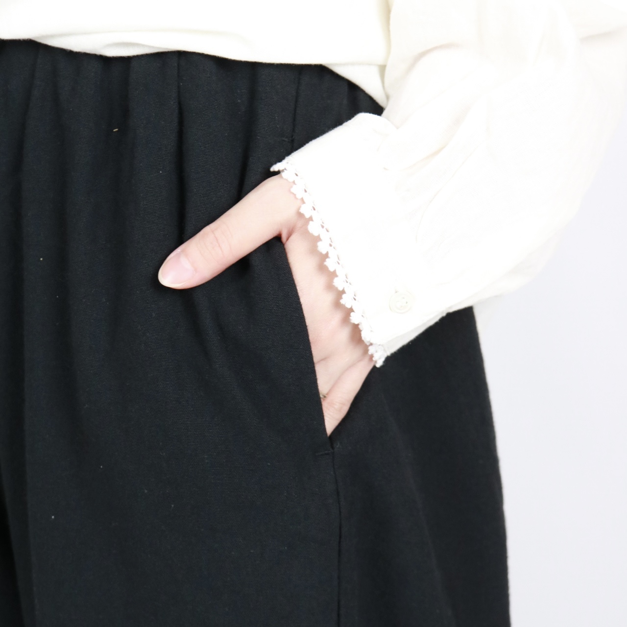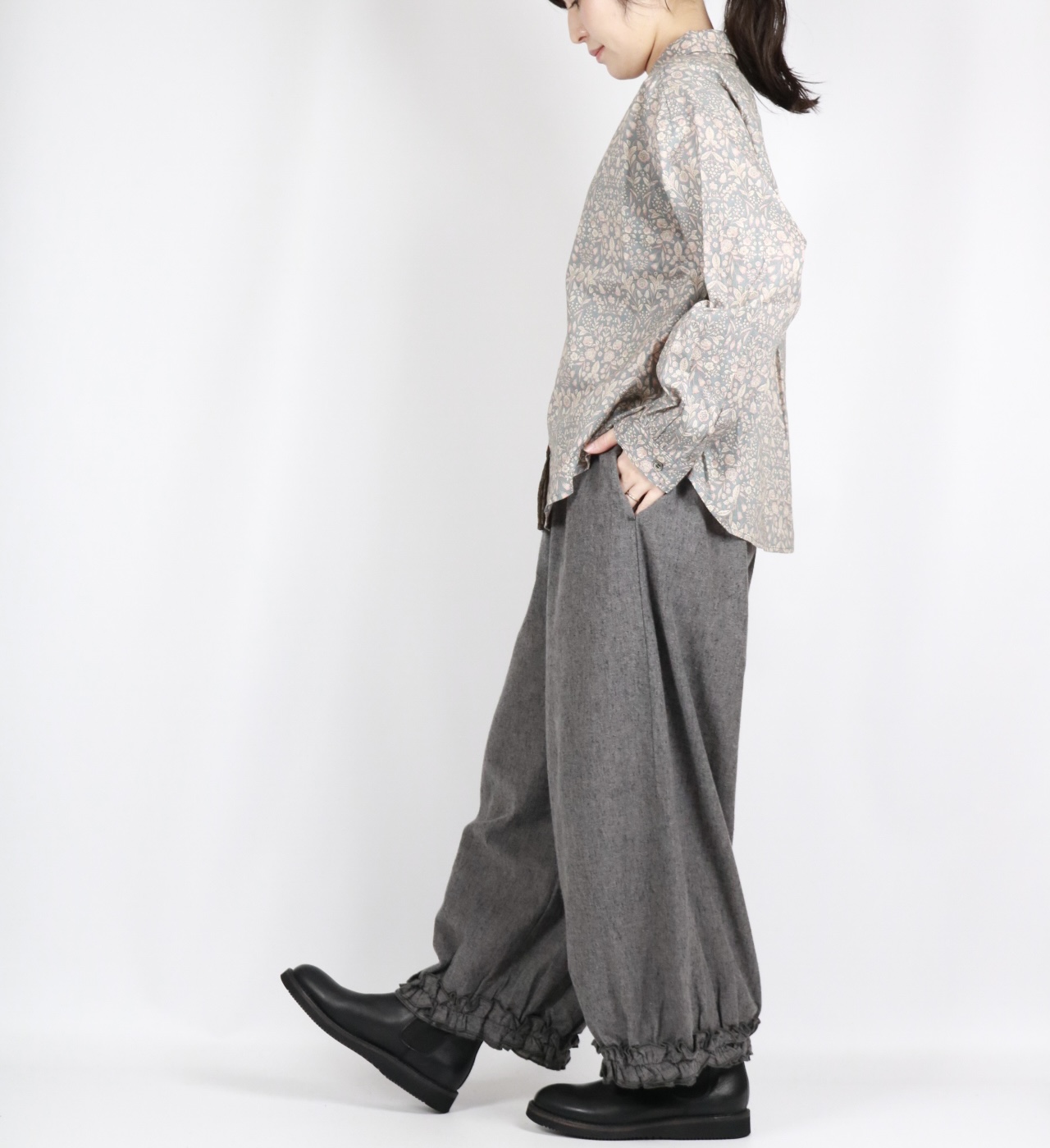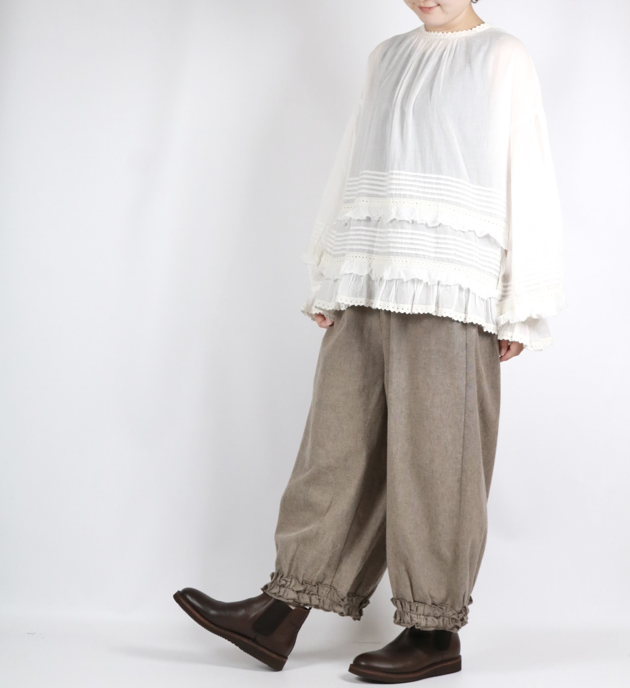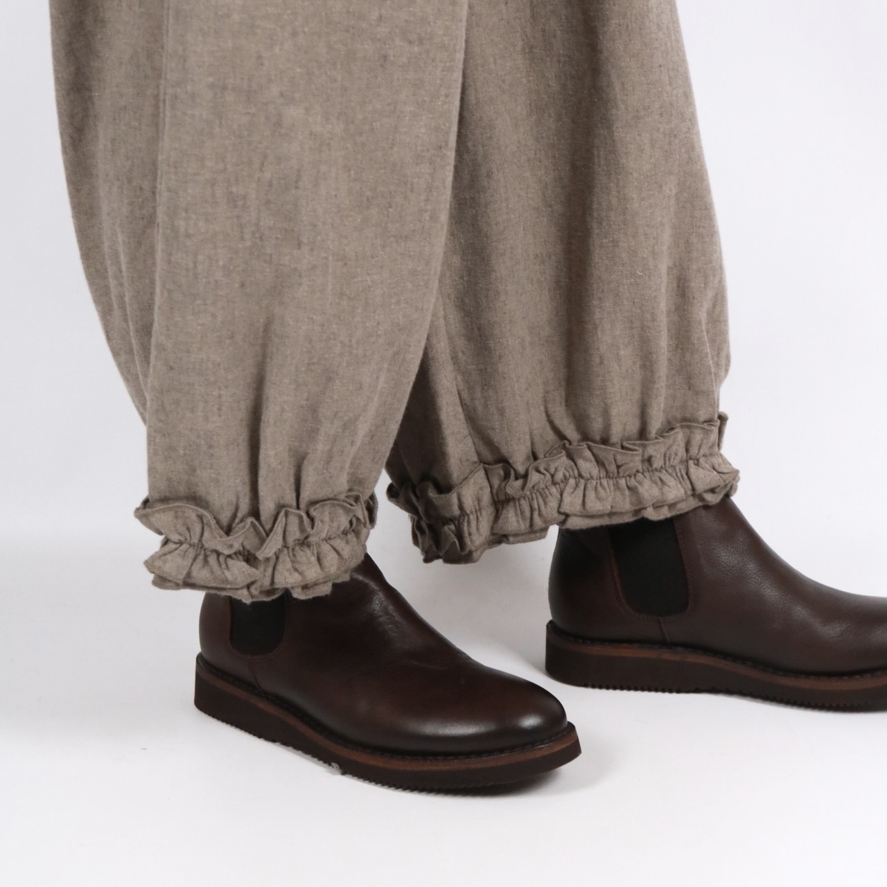 - > bluewillow コットン平織り無地起毛裾フリルパンツ 3色