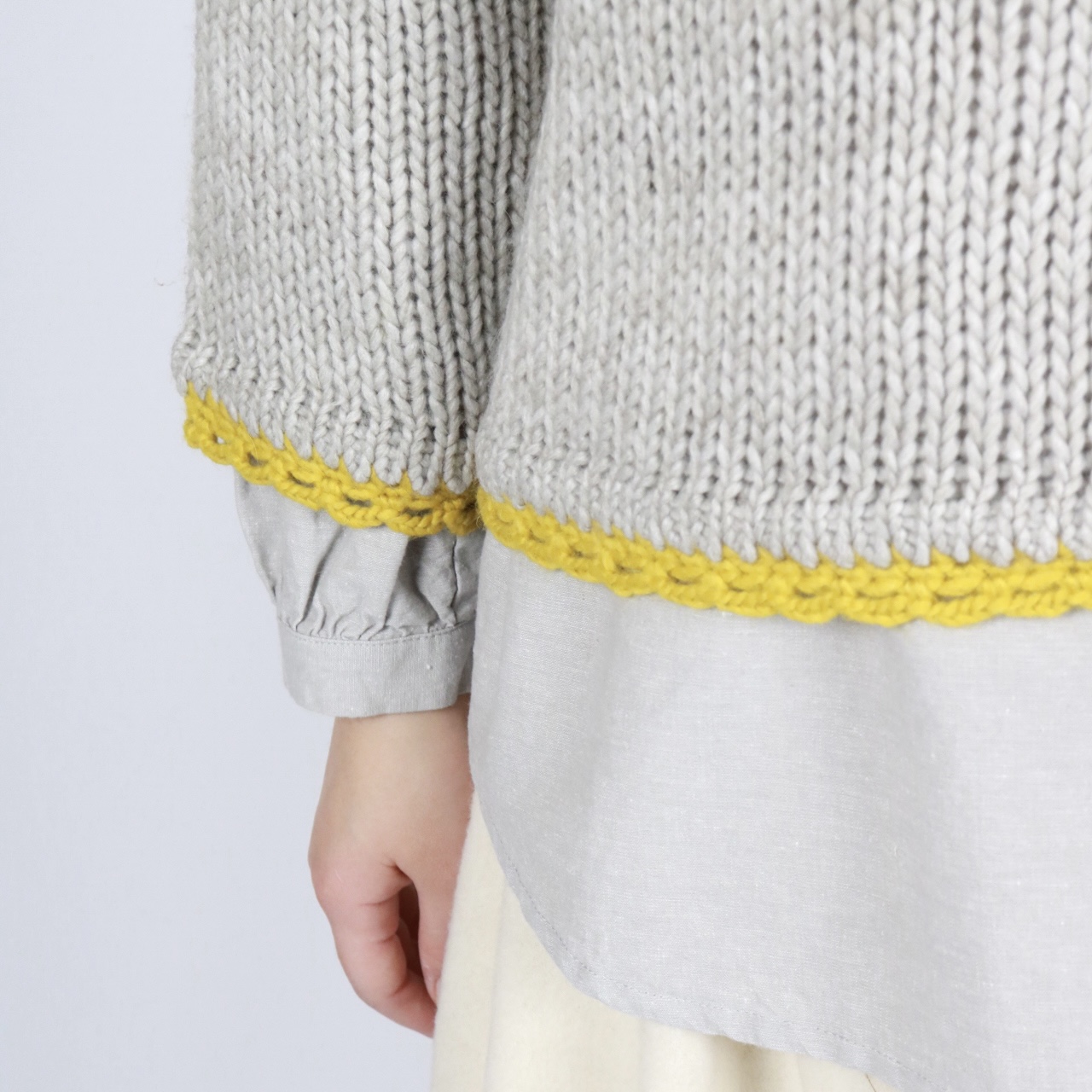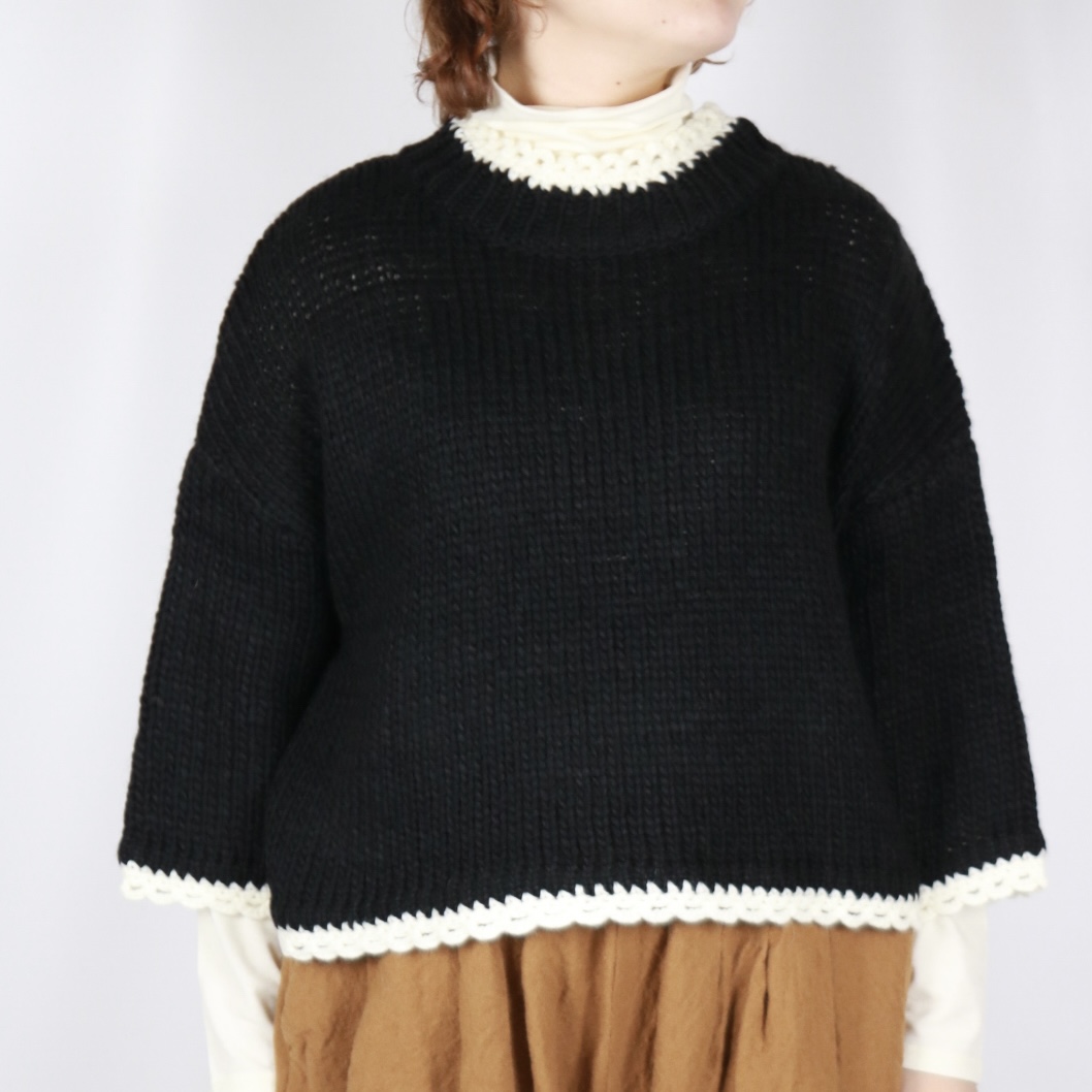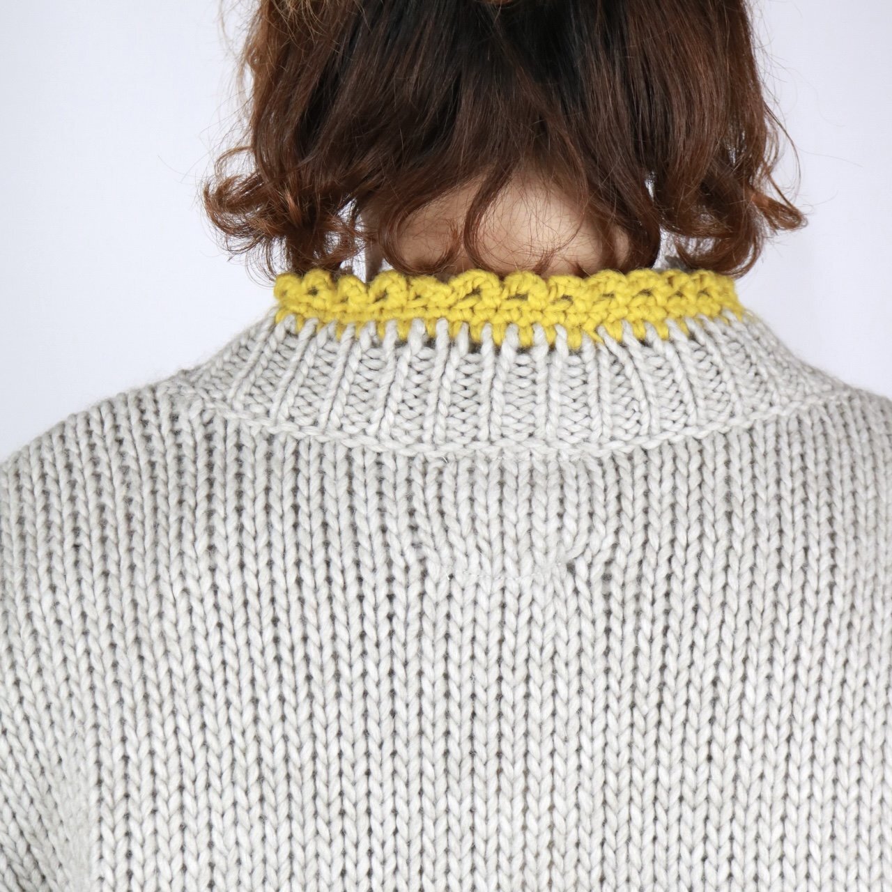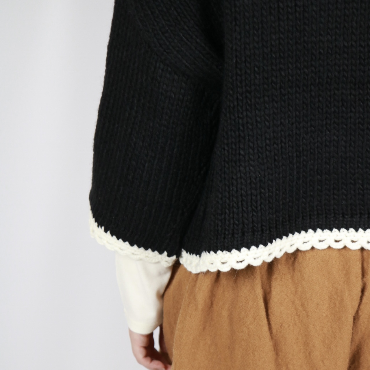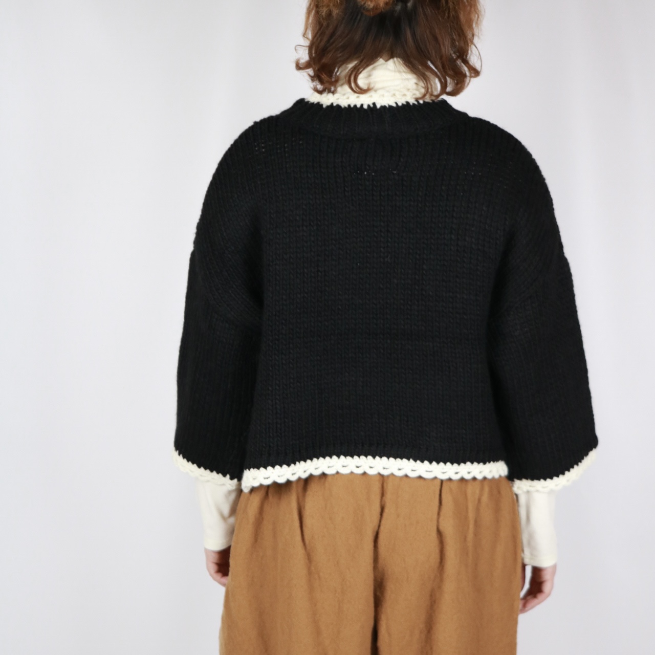 柔らかく暖かいニットに襟元、袖、裾部分の配色のハンドメイドスカラップが目をひく