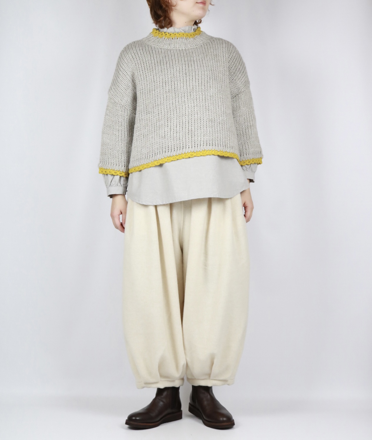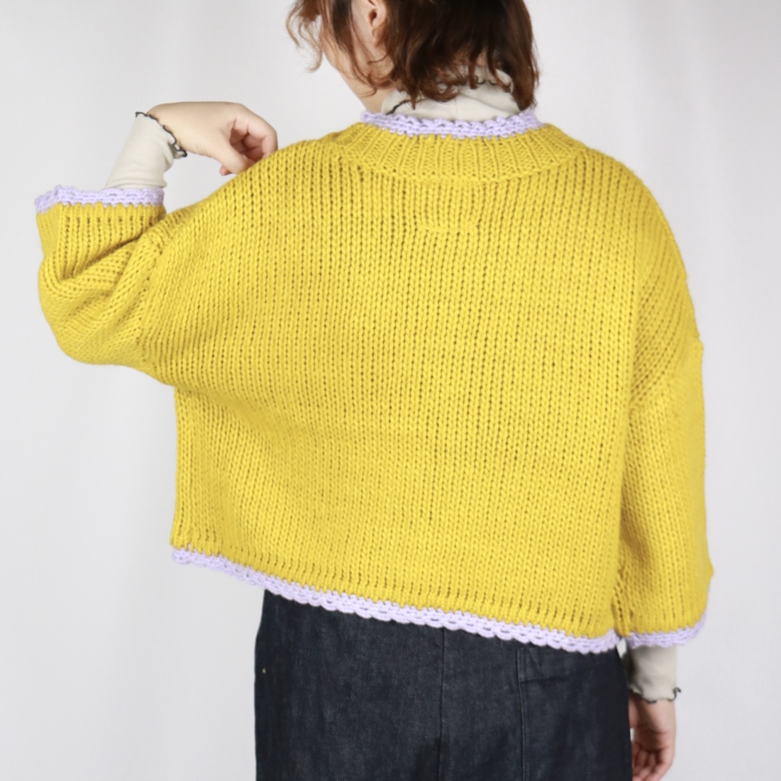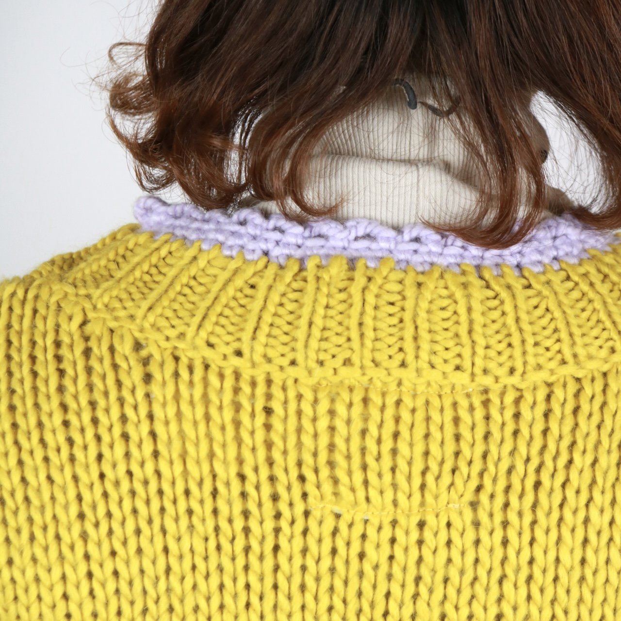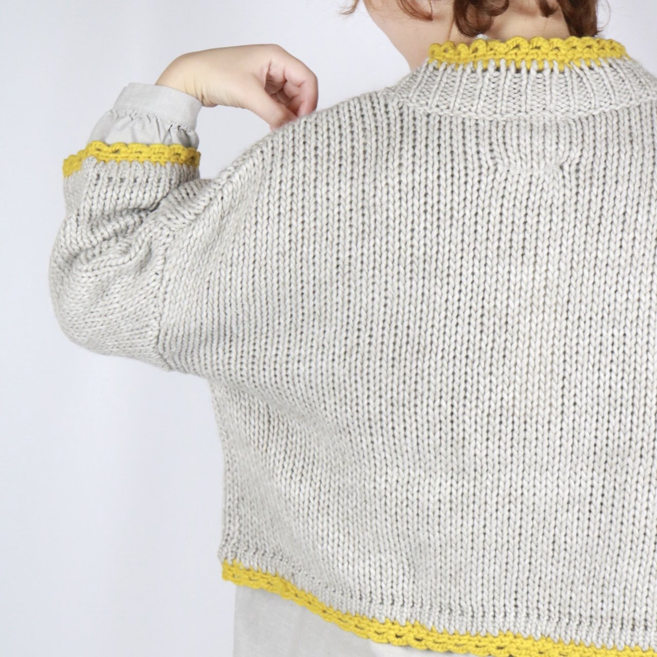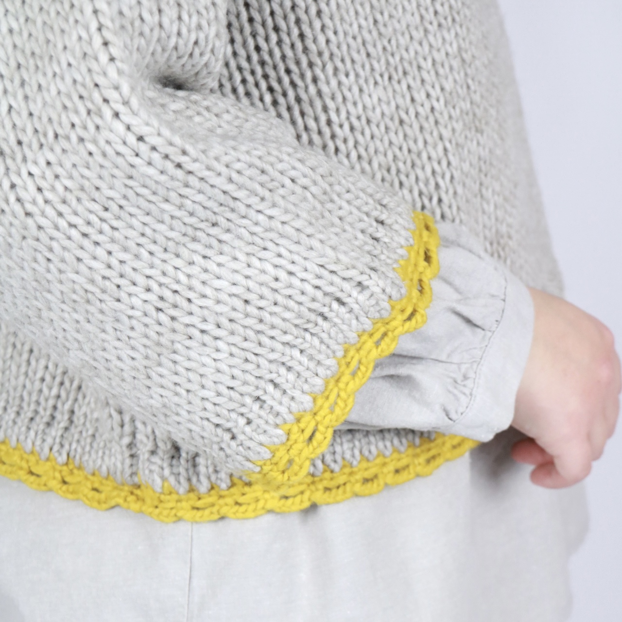 柔らかく暖かいニットに襟元、袖、裾部分の配色のハンドメイドスカラップが目をひく