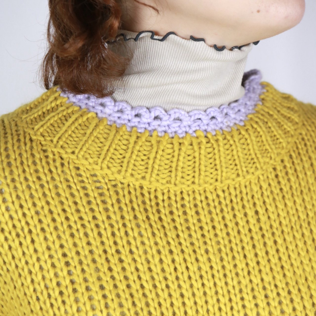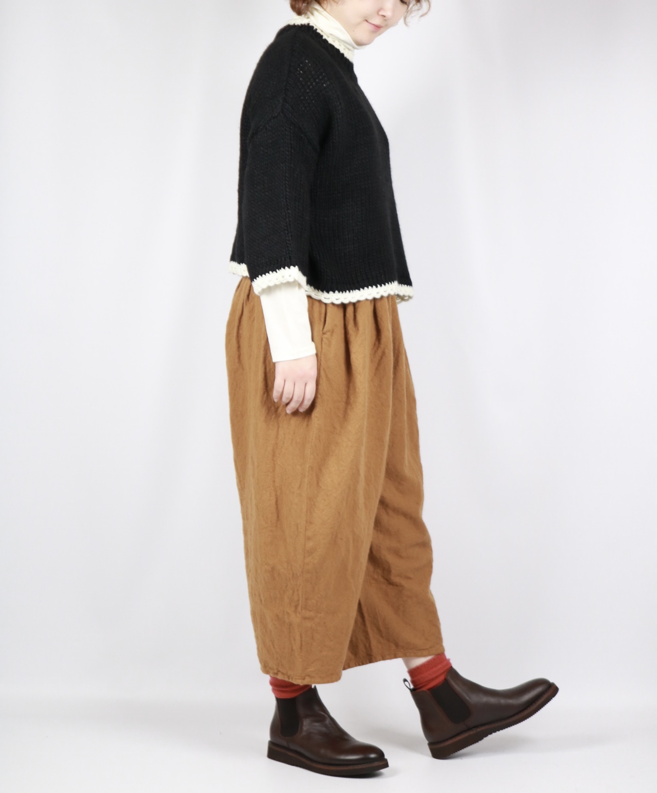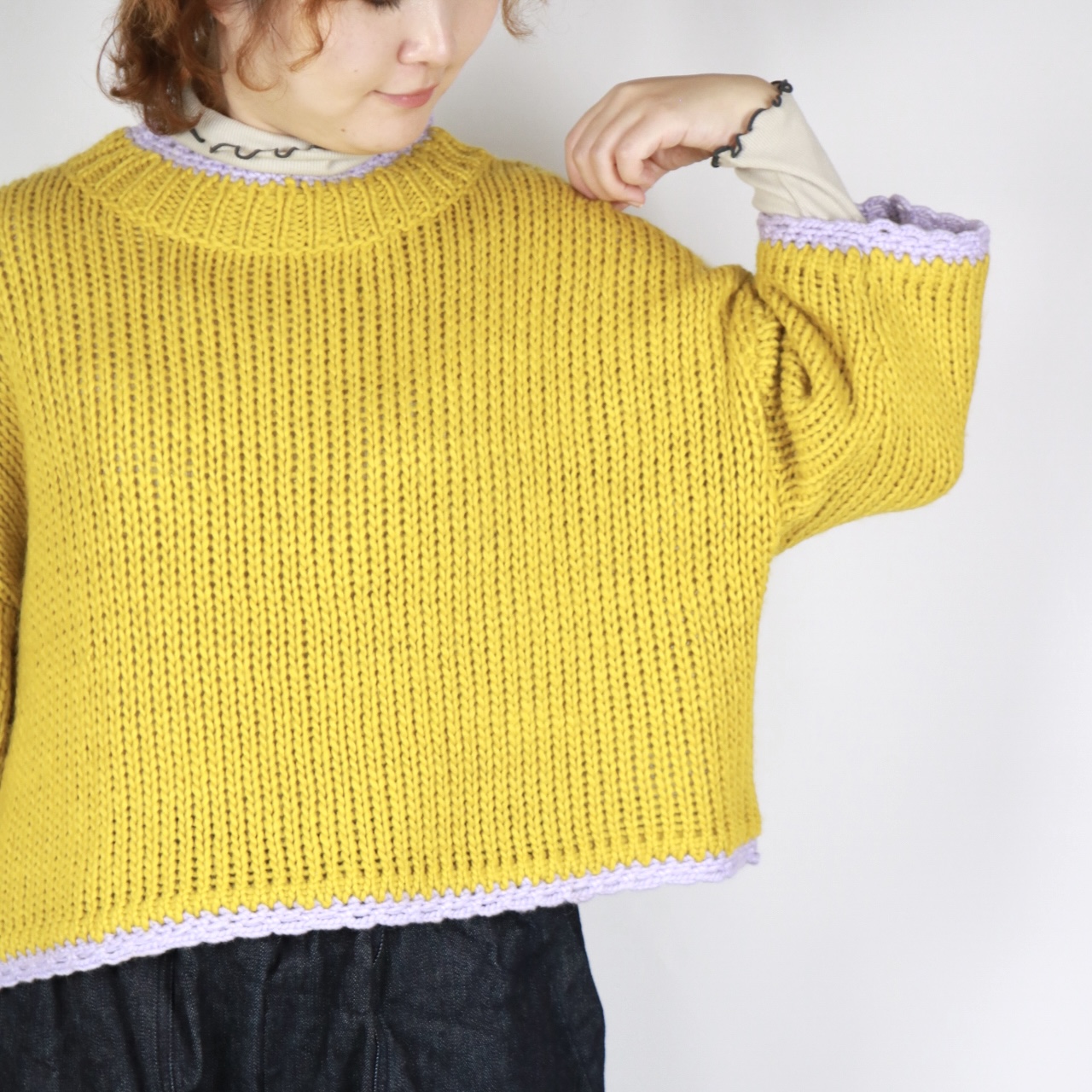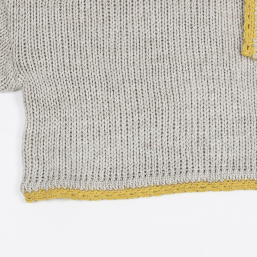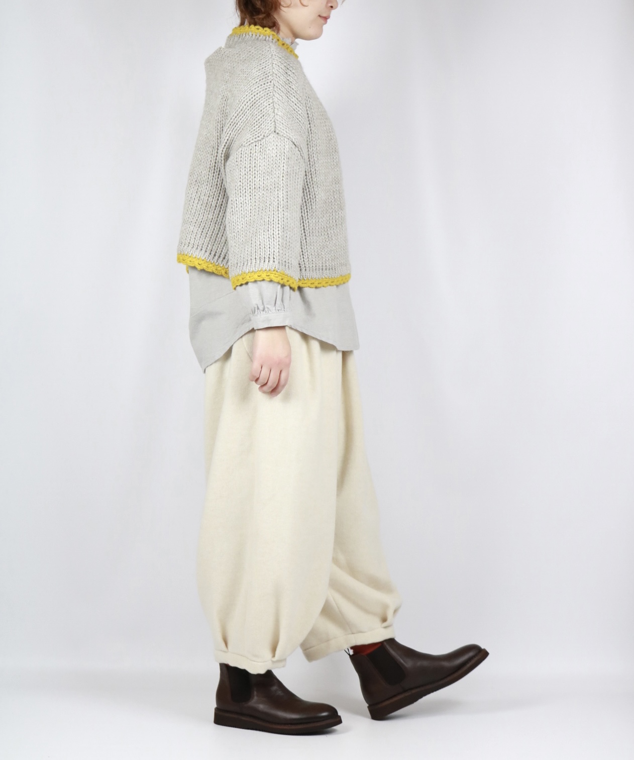 柔らかく暖かいニットに襟元、袖、裾部分の配色のハンドメイドスカラップが目をひく
